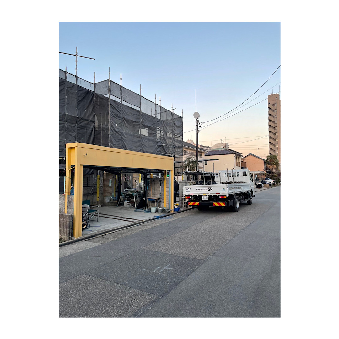 新築戸建て外壁リフォーム工事 新築防水工事 新築シーリング工事 新築外壁塗装工事 新築仮設工事 新築昇降階段 新築ステージ足場 メッシュシート 増築工事 先行足場